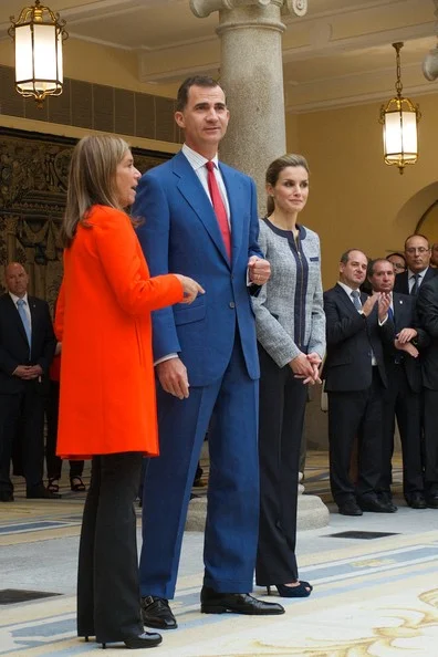 Queen Letizia even makes a pony tail look elegant in this ensemble and I love the jacket. Unfortunately I don't particularly like the pants as they seem a little ill fitting. However, I do like the concept and to be honest, she is certainly exuding confidence and looking fine. Just looking a photos 5 & 6 shows how relaxed she is and how great her makeup is. Well done.