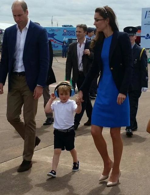 | Prince William, Duke of Cambridge, Catherine, Duchess of Cambridge and Prince George visit the Royal International Air Tattoo at RAF Fairford on July 8, 2016 in Fairford, England. The Duchess is patron of the Air Cadet Organisation and has visited the Air Tattoo stages official celebrations to mark the Air Cadets' 75th anniversary. The Duchess recycled a blue Stella McCartney dress she's worn on two previous occasions. Duchess teamed the dress with her navy Smythe One-Button Blazer. |