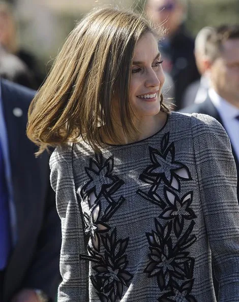 | On March 01, 2017, Queen Letizia of Spain attended closing day of the 'Woman and disability- We cross borders' International Congress at the Lienzo Norte Exhibition and Congress Center in Avila, Spain. (Queen Letizia wore Carolina Herrera Prince Of Wales Floral Cutout Dress) |