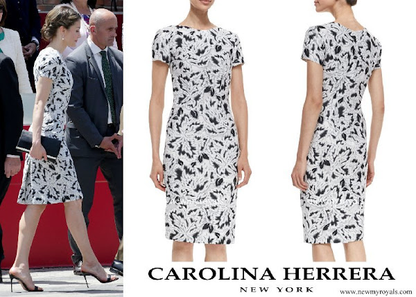 On 27 May 2017, King Felipe VI and Queen Letizia of Spain attended the 2017 Armed Forces Day parade held in Guadalajara (Castilla-La Mancha), Spain. Queen Letizia wore Carolina Herrera Parrot Tulip Fil Coupe Sheath Dress