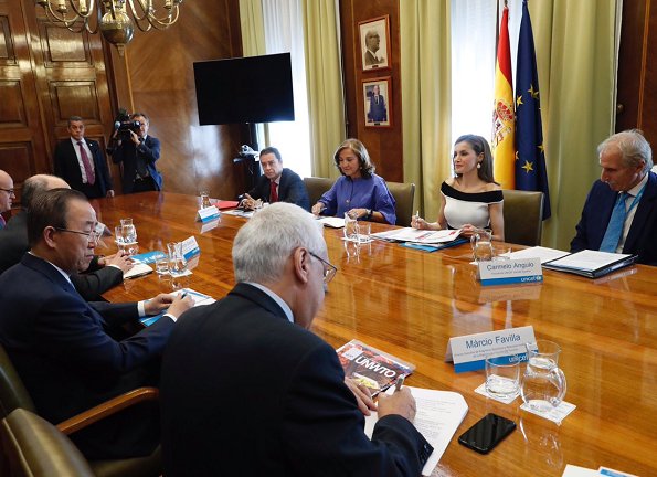| On June 13, 2017, Queen Letizia of Spain and former United Nations (UN) secretary general Ban Ki-moon attend a meeting on 'Sustainable Development Goals in Spain' in Madrid. Queen Letizia wore a striped off-the-shoulder knit dress by Carolina Herrera. |