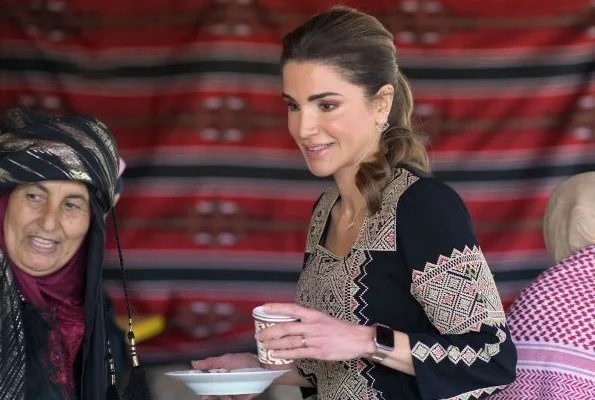 | On April 3, 2019, Queen Rania visited Wadi Shueib in Balqa Governorate and met with a group of women from a local charity. The Queen received information about the home based initiatives of the women. Wadi Shueib is the arabic name for the Valley of Jethro. It is a wadi in Jordan draining an area of nearly 180 square kilometers. Excavations confirmed that the area was a major site during Jordan's Neolithic period. |