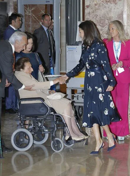 | On June 11, 2019, Queen Letizia of Spain attended presentation ceremony of the 2019 UNICEF Spanish Committee Awards, held at Spanish National Research Council (CSIC) headquaters in Madrid. These awards, convened on a biennial basis in four international categories, highlight the cultural, social or human work of national and international persons, groups or institutions related to the well-being of children. Queen Letizia is the honorary president of the UNICEF Spanish Committee. (Queen Letizia wore a floral print dress by Massimo Dutti.) |