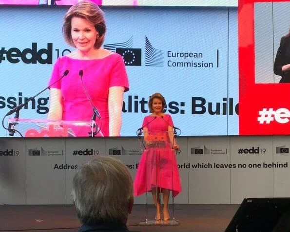 | On June 18, 2019, Queen Mathilde of Belgium attended the opening session of the European Development Days 2019 (ADD19) at Tour & Taxis in Brussels, Belgium. This year's European Development Days theme is ‘Addressing inequalities: building a world which leaves no one behind'. (Queen Mathilde wore a new pink midi dress by Natan.) |