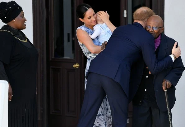 | On the third day of their South Africa tour, The Duke and Duchess of Sussex began the day with a visit to The Desmond & Leah Tutu Legacy Foundation (DTHF). The Duke and Duchess, and their baby son Archie Mountbatten-Windsor met Nobel Peace Laureate 1984, Archbishop Desmond Tutu and Mrs. Tutu at their foundation. (The Duchess of Sussex wore a new wore silk midi dress by Clup Monaco.) |