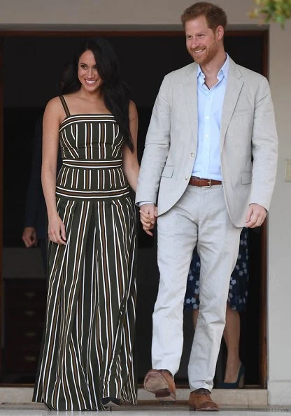 | On September 24, 2019, The Duke of Sussex and the Duchess of Sussex attended a reception for young people, community and civil society leaders held at the Residence of the British High Commissioner in Cape Town, South Africa, during the royal tour of Southern Africa. 200 guests attended the reception. The royal couple were hosted at the garden party by Nigel Casey, British High Commissioner to South Africa. The Duchess of Sussex wore a pleated stripe long dress by Martin Grant. |