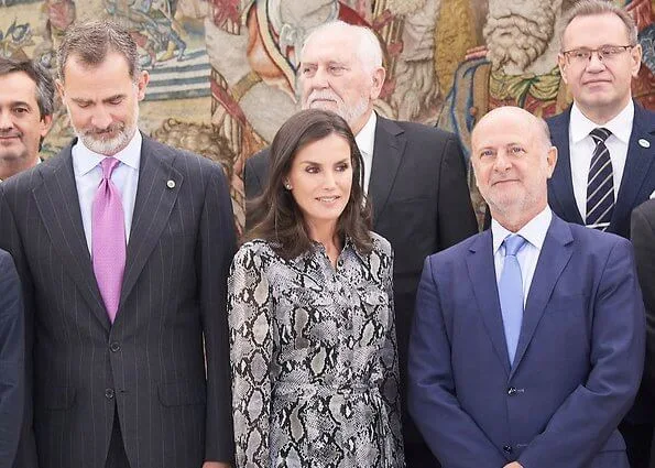 On the occasion of the 28th annual Congress of the European Academy of Dermatology and Venereology (EADV) to be held on October 9-13, 2019 at IFEMA in Madrid, King Felipe VI of Spain and Queen Letizia of Spain received the Board members of EADV at Zarzuela Palace. The EADV Congress is the largest European annual event on Dermatology and Venereology. The prestigious event will focus on Skin Imaging. Queen Letizia wore a snakeskin print dress by Massimo Dutti.