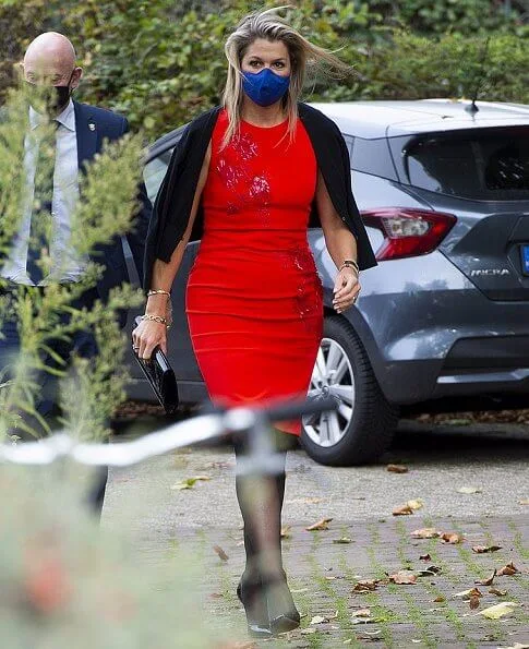 En 2016, Maxima portait ce modèle Natan à merveille. Sa silhouette a changé et la robe est trop serrée ; je ne trouve pas qu'elle est courte ; la longueur est juste au dessus du genou. La couleur noire du cardigan et des collants s'harmonisent bien avec le rouge de sa toilette !