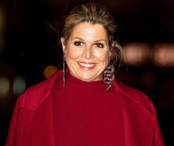 Queen Maxima wore a claret multi embroidered wool cashmere coat from Oscar de la Renta, and a red open-back midi dress from Massimo Dutti.