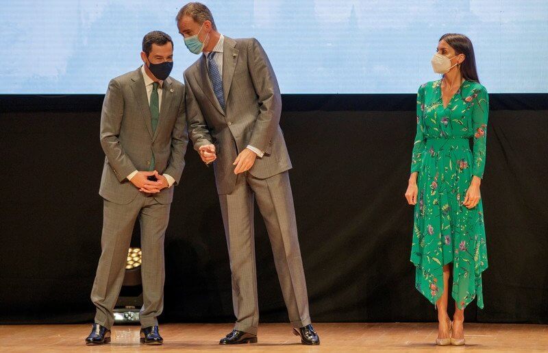 Queen Letizia wore a green floral prints silk midi dress from Maje Paris. Awards ceremony at Alhambra Palace