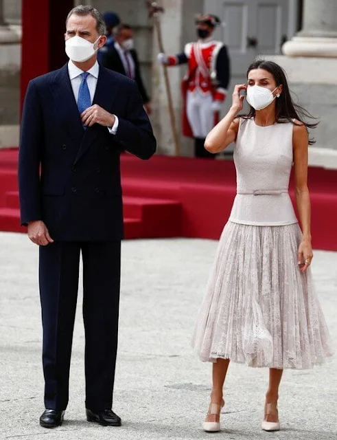 I think Letizia's outfit is too informal as senior hosts for welcoming Guests of Honour who are starting a state visit. Frothy skirt, bare arms, loose hair blowing in the wind... She has looked more formal on lesser occasions. Just my opinion.