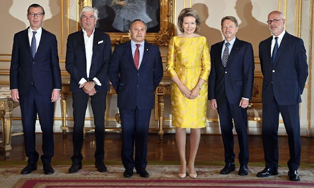 It is quite possible that Queen Mathilde is wearing a dress made from the fabric of one of the court suppliers, perhaps even a gift, hence the unusual colour and becoming style.