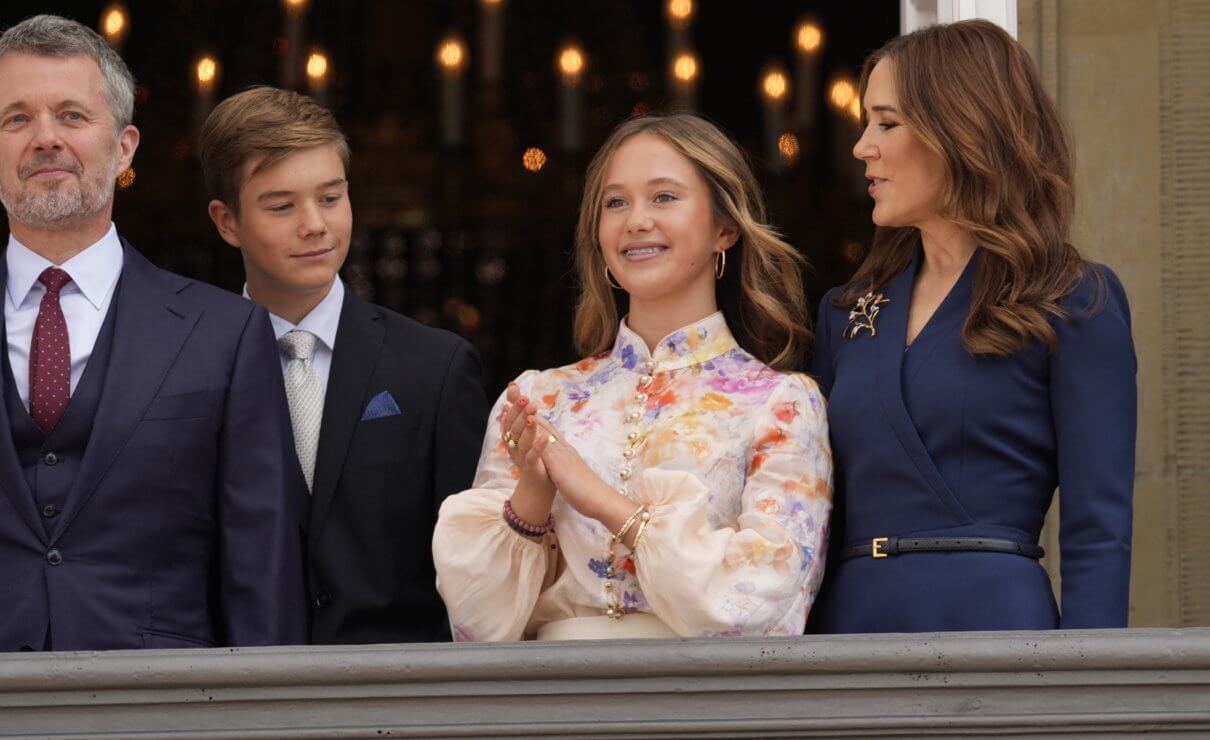 On May 26, King Frederik, Queen Mary, Queen Margrethe, Princess Isabella, Prince Vincent, and Princess Josephine watched the birthday parade and waved to the crowd gathered in front of Frederik VIII’s Palace at Amalienborg.